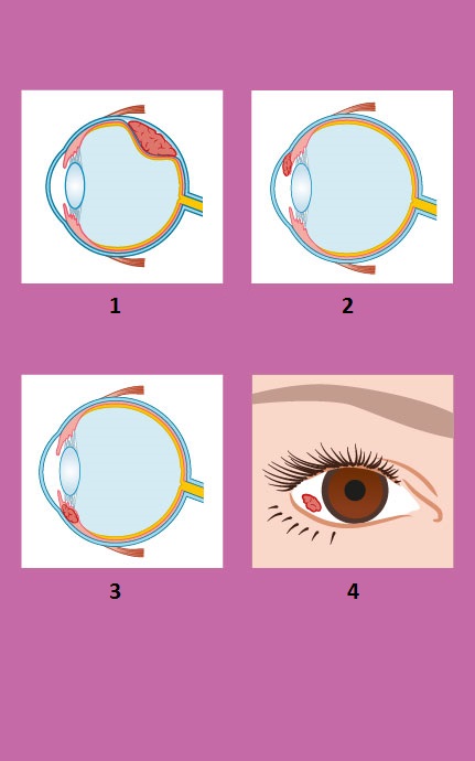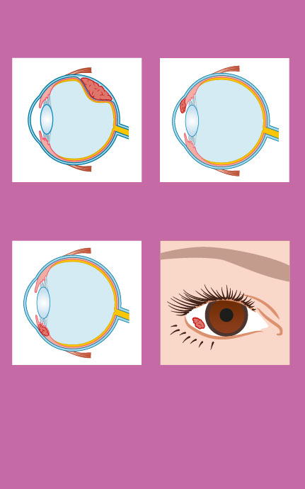 Een oogmelanoom kan op 4 plaatsen van het oog groeien: