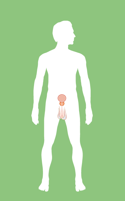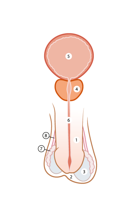 1. Penis, 2. Balzak, 3. Zaadballen, 4. Prostaat, 5. Blaas, 6. Plasbuis, 7. Bijbal, 8. Zaadleider