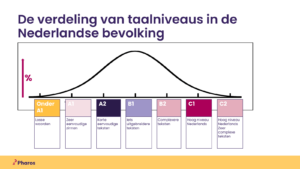 In Nederland gebruiken we taalniveaus om aan te geven hoe makkelijk of moeilijk een tekst is. Voor mensen die Nederlands als tweede taal spreken hebben we het over niveau A1 tot en met C2, van makkelijk naar moeilijk. Die indeling wordt ook gebruikt voor mensen die Nederlands als moedertaal spreken maar dat is eigenlijk niet correct. Omdat het echter veel gebruikt wordt gebruikt Pharos deze aanduidingen ook.