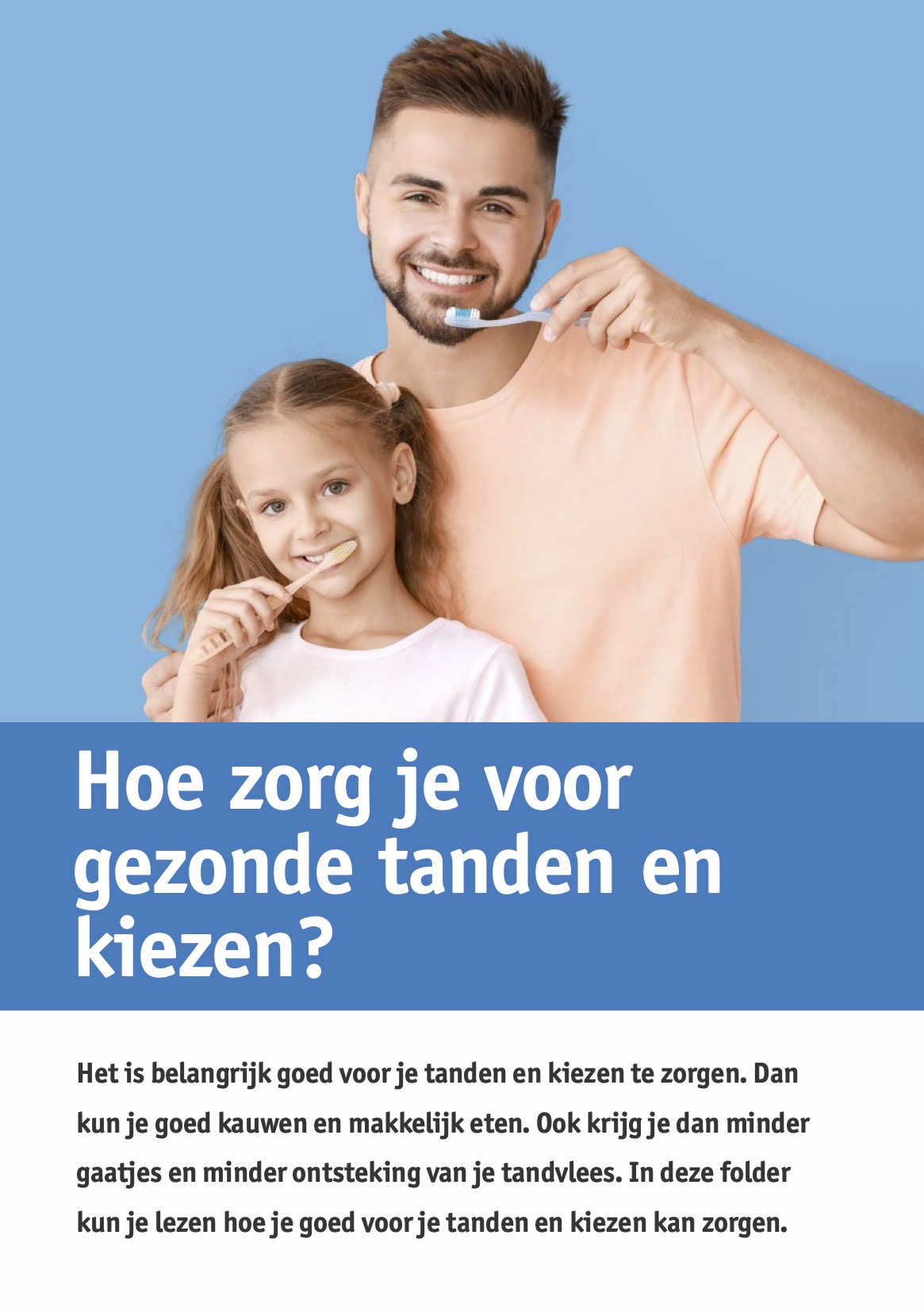 Dit is een folder in eenvoudige taal over het verzorgen van de mond en het gebit. En over de mondzorg in Nederland. In de folder staan duidelijke afbeeldingen. Mensen die moeite hebben met lezen en schrijven en anderstaligen lezen hoe zij goed voor tanden en kiezen kunnen zorgen.