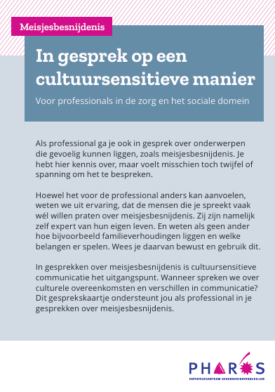 Wanneer spreken we over culturele overeenkomsten en verschillen in communicatie? Dit gesprekskaartje ondersteunt jou als professional in je gesprekken over meisjesbesnijdenis.
