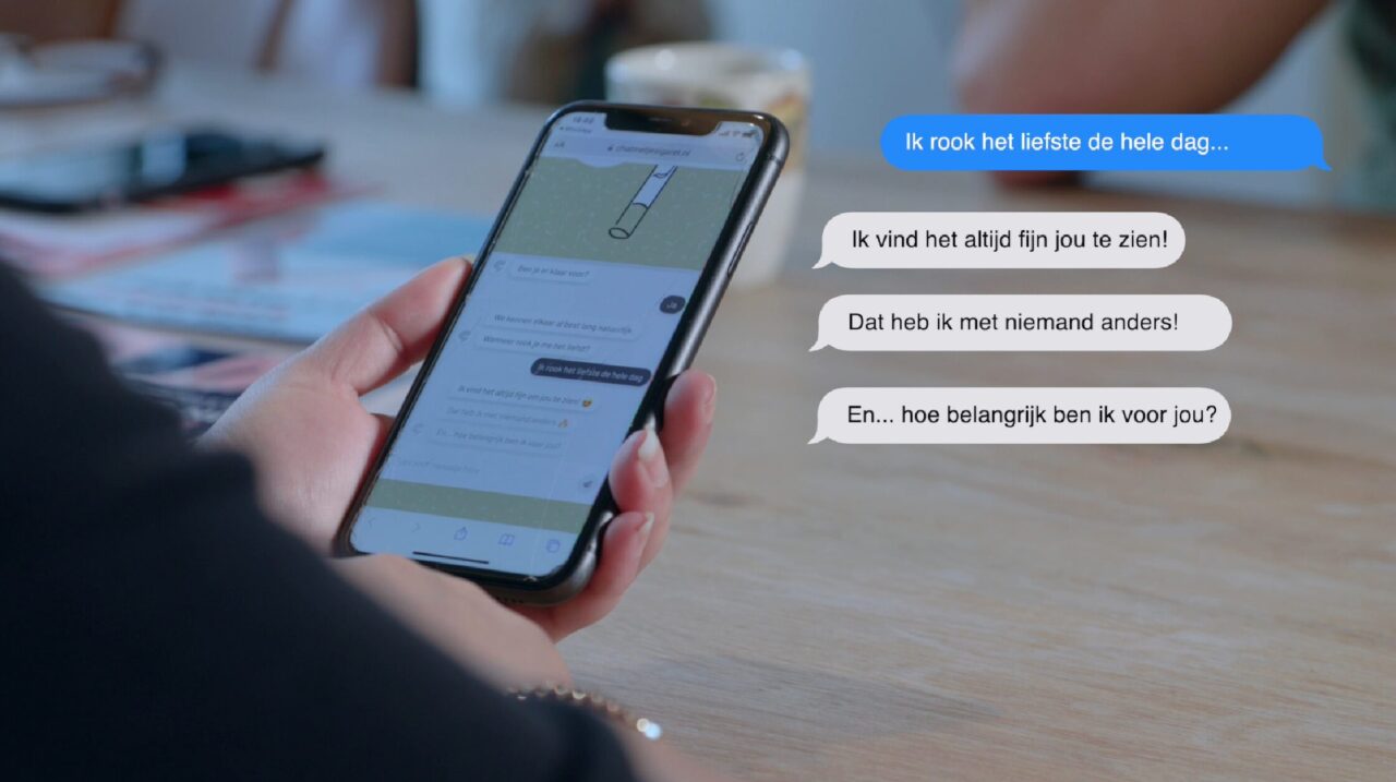 Het gespreksmiddel Chat met je sigaret is anders dan je verwacht van hulp. Niet aardig en behulpzaam, zoals een ober die je op een rustige manier uitlegt wat de opties zijn. En elke keuze respecteert. De sigaret waarmee je chat is manipulatief en doet alsof hij je beste vriend is. Hij pakt je helemaal in. Je vindt hem geweldig. Het voelt als een onderonsje met de roker in jezelf. Wat betekenen wij voor elkaar? Jij kan toch niet zonder mij? Geef jij mij wel genoeg? Chatten met deze sigaret is lachen, maar vooral dwingend. Roken voelt ineens minder vrijblijvend.